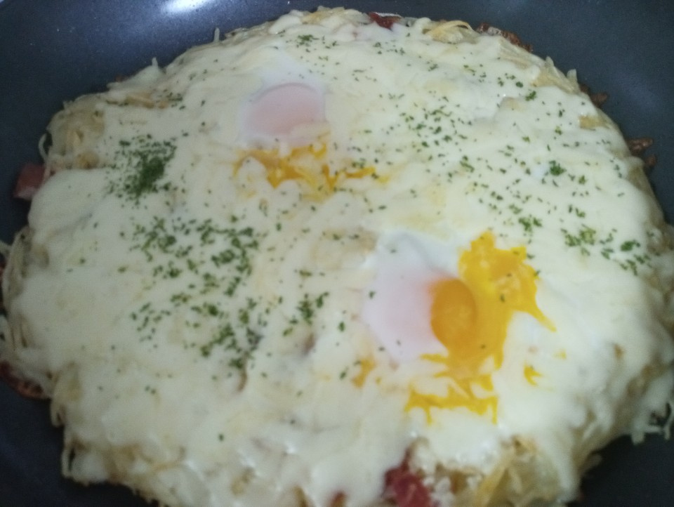 감자채가 앞뒤로 노릇하게 잘 익고 바삭해졌다면, 팬 중앙 부분을 살짝 눌러 홈을 파고 계란 1개를 깨뜨려 넣어주세요. 노른자는 터뜨리지 않고 그대로 익힐 수 있습니다.