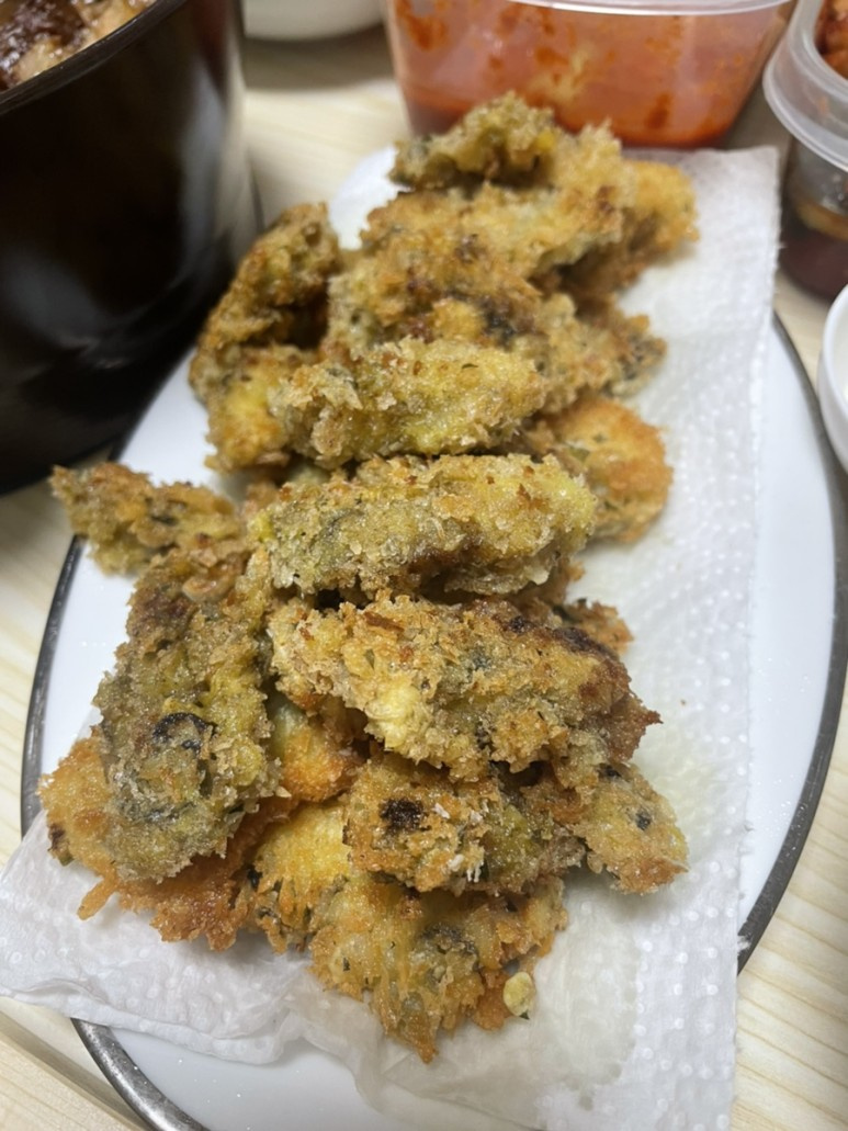 완성된 굴튀김은 그 자체로도 훌륭한 술안주지만, 밥반찬으로도 손색없습니다. 이날은 술을 마시지 않는 날이었지만, 맛있는 굴튀김 덕분에 모두들 폭풍 식사를 즐겼답니다.