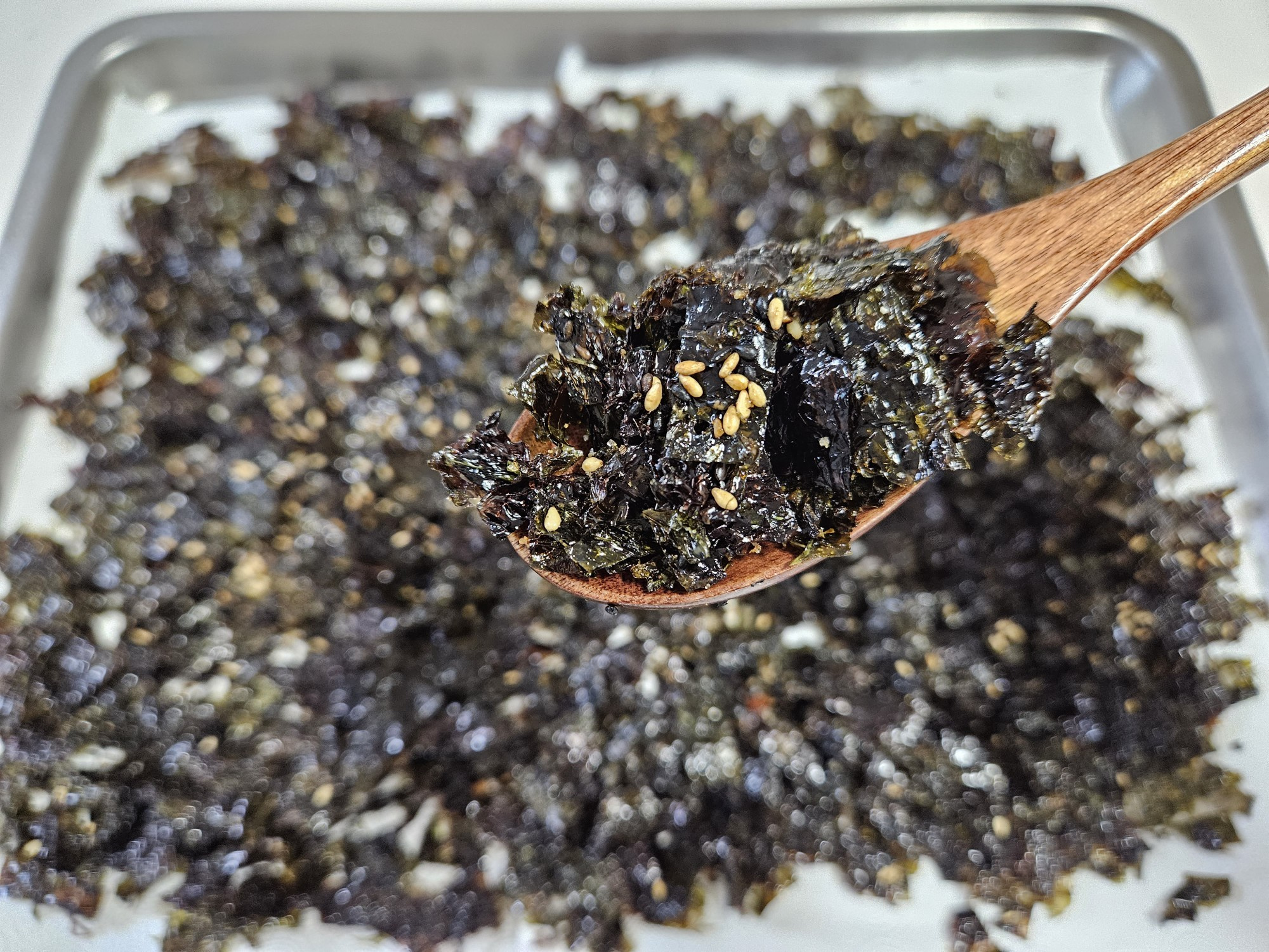 완성된 김자반을 넓은 쟁반이나 채반에 펼쳐 뜨거운 김을 날려줍니다. 이렇게 식혀야 김자반이 더욱 바삭해집니다.