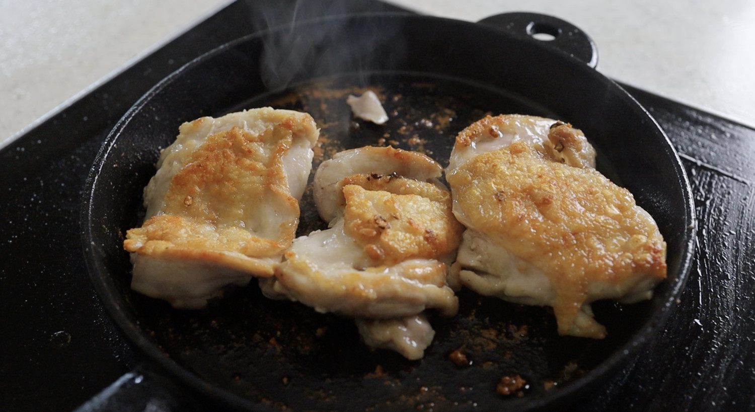 팬을 센 불로 충분히 예열해 주세요. 예열된 팬에 밑간한 닭다리살을 껍질 부분이 바닥으로 가도록 올려주세요. 닭껍질에서 충분히 기름이 나오기 때문에 별도로 기름을 두를 필요가 없습니다. 껍질부터 바삭하게 익혀주는 것이 이 레시피의 핵심입니다!