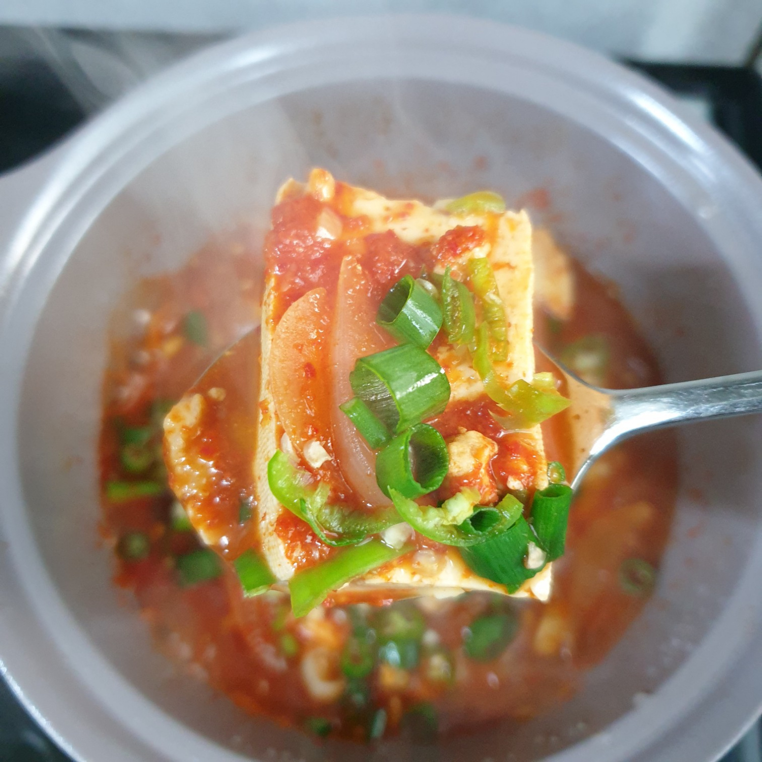 두부 속까지 양념이 푹 배어들고 국물이 자작하게 졸아들어 짭쪼름하고 맛있는 맛이 완성되면, 마지막으로 썰어둔 대파와 청양고추를 넣고 한소끔 더 끓인 후 바로 불을 꺼주세요. 따끈한 밥 위에 얹어 쓱쓱 비벼 먹으면 정말 꿀맛이랍니다! 맛있게 드세요!