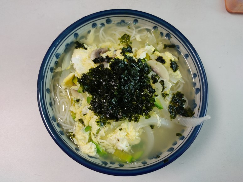 준비된 그릇에 삶아 놓은 소면을 보기 좋게 담고, 그 위로 뜨겁게 데운 잔치국수 육수를 자작하게 부어줍니다. 마지막으로 김가루와 준비한 고명(채 썬 채소, 계란 지단 등)을 보기 좋게 올려주세요.