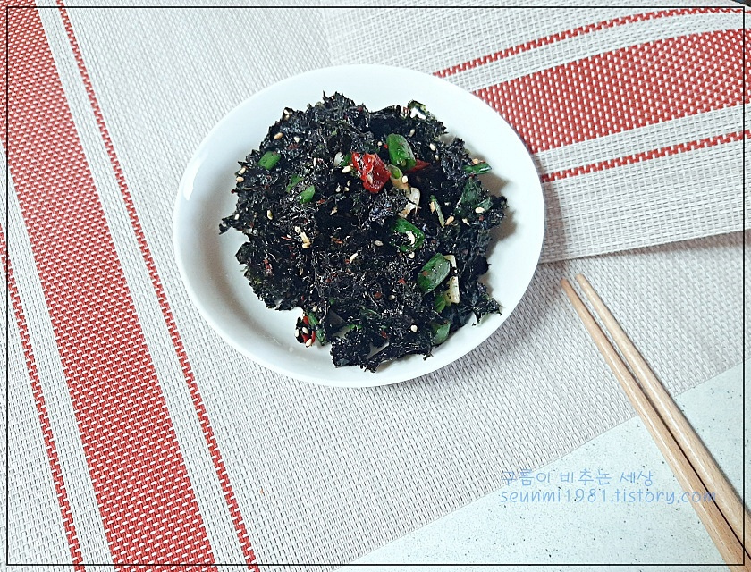 별미 밑반찬으로 좋은 김무침, 묵은 김으로도 충분히 맛있게 만들 수 있어요! 냉동실에 잠들어 있던 곱창김을 활용해 향긋하고 감칠맛 나는 김무침을 만들어 보세요. 겨울철 따끈하게 구워 먹는 곱창김도 별미지만, 여름철이면 처치 곤란인 묵은 김도 김무침으로 변신시키면 훌륭한 밥도둑이 된답니다. 5분이면 충분하니 지금 바로 도전해보세요!