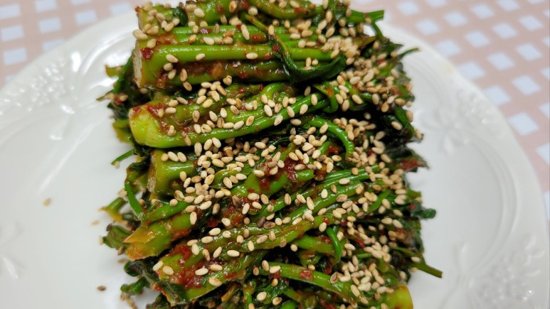 간 보고 완성하기: 완성된 김치의 간을 살짝 보고, 입맛에 맞도록 부족한 간은 소금이나 액젓으로 조절해주세요. 맛이 잘 어우러졌다면 접시에 먹기 좋게 담고, 마지막으로 볶은 통깨 1큰술을 솔솔 뿌려주면 맛있는 엄나무순 김치 완성입니다. 바로 드셔도 맛있고, 냉장 보관하며 드시면 더욱 좋습니다.