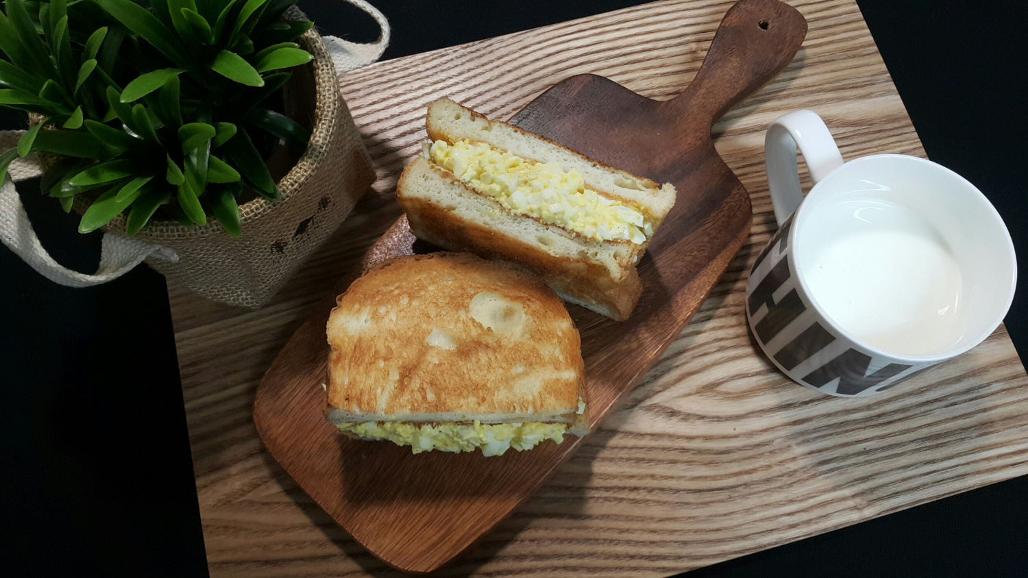 나머지 식빵 한 장으로 덮어주면 맛있는 달걀 샌드위치 완성입니다! 취향에 따라 반으로 잘라 즐기시면 됩니다. 부드럽고 촉촉한 달걀 샌드위치로 즐거운 브런치 시간을 보내세요.