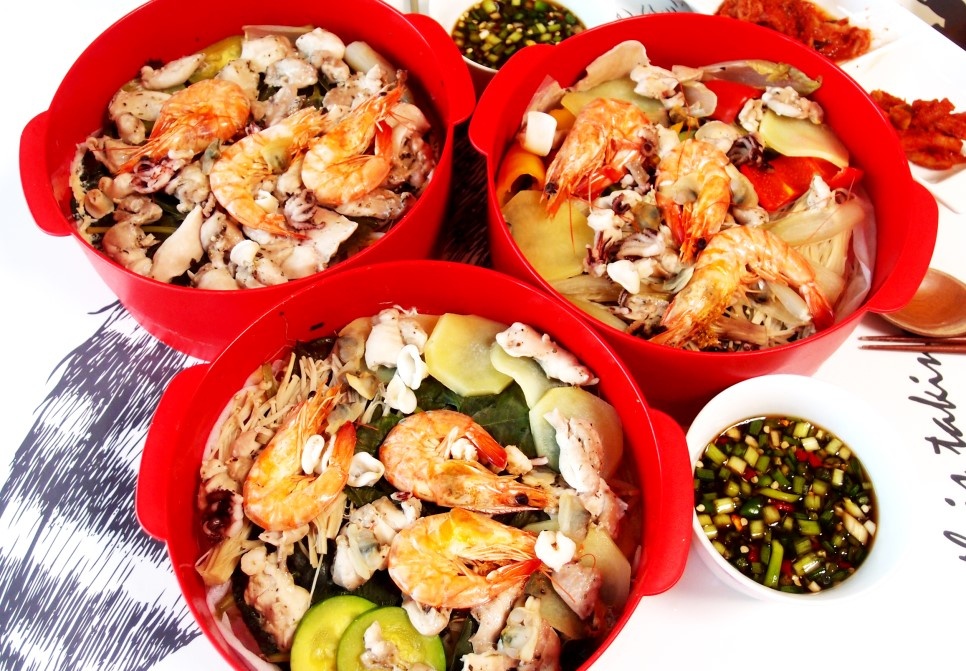 마지막으로 신선한 새우와 냉동 해물 믹스를 닭다리살과 채소 위에 보기 좋게 올립니다. 모든 재료를 찜통에 담았으니, 이제 뚜껑을 닫고 맛있게 쪄내기만 하면 됩니다.