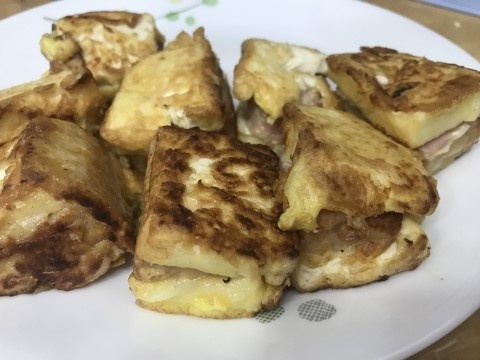 부침가루를 묻힌 샌드를 달걀물에 푹 담가 앞뒤로 계란 옷을 골고루 입혀줍니다. 계란물이 넉넉해야 나중에 부칠 때 더욱 맛있어요.