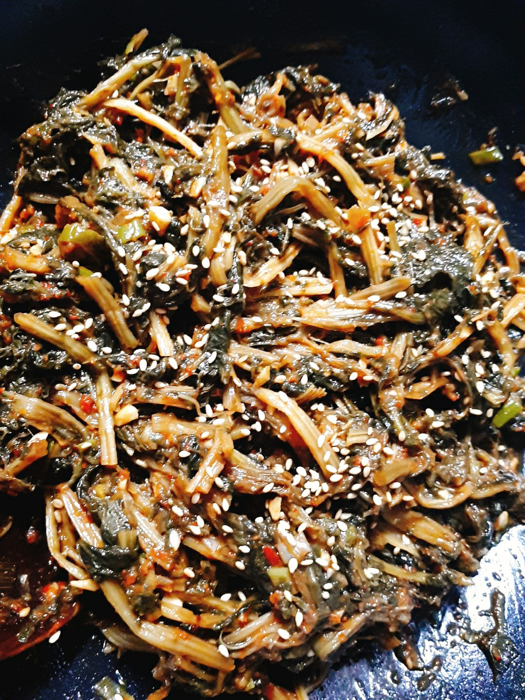 약 3~5분간 시래기가 적당히 익을 때까지 볶아줍니다. 불을 끄기 직전에 참기름을 빙 둘러주고, 통깨를 솔솔 뿌려 마무리하면 고소하고 맛있는 무청 시래기나물 볶음이 완성됩니다.