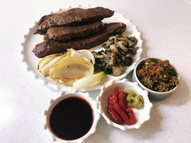 잘 구워진 뼈 없는 우대갈비를 먹기 좋은 크기로 썰어 준비한 플레이팅 접시에 보기 좋게 세팅해주세요. 홈파티 분위기를 물씬 풍길 수 있습니다.
