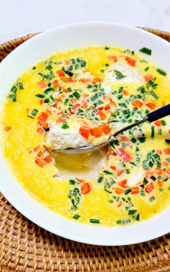 순두부 위에 다져둔 파프리카와 대파를 골고루 뿌려줍니다. 색감을 풍성하게 하고 싶다면 야채를 넉넉히 넣으셔도 좋지만, 순두부 본연의 부드러움을 강조하고 싶다면 야채 양을 조절하거나 계란물에 미리 섞어 넣어도 좋습니다.