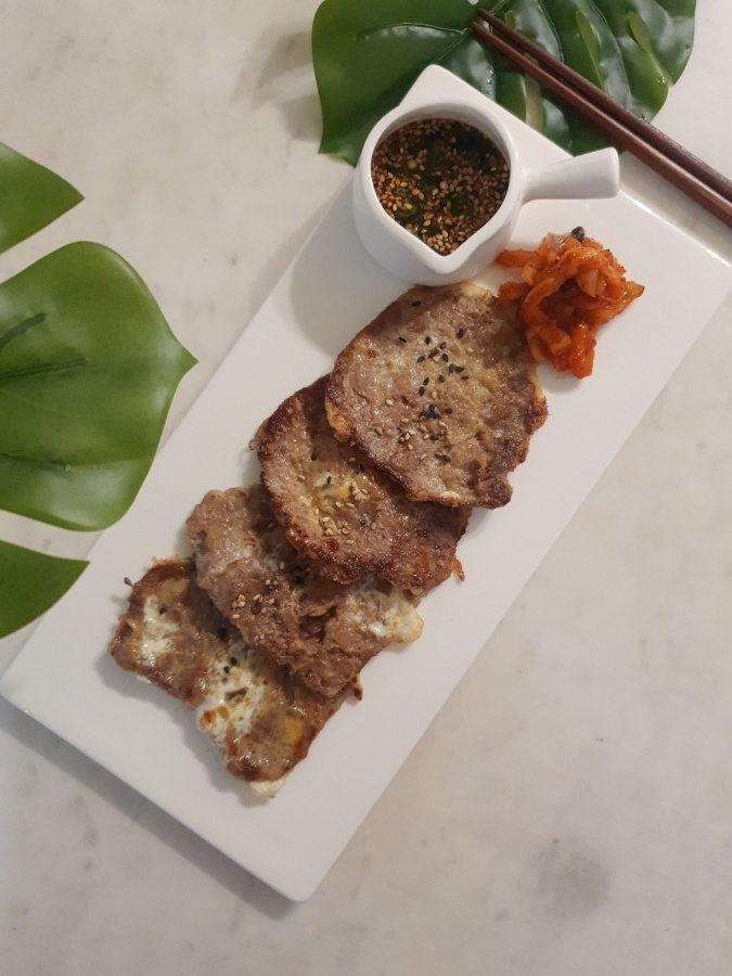 예열된 팬에 계란 옷을 입힌 소고기를 올리고 앞뒤로 노릇하게 구워주세요. 홍두깨살은 얇기 때문에 오래 익힐 필요가 없어요. 각 면마다 약 1~2분 정도씩, 예쁜 갈색빛이 돌면 완성입니다. 따뜻할 때 바로 드시면 가장 맛있어요!