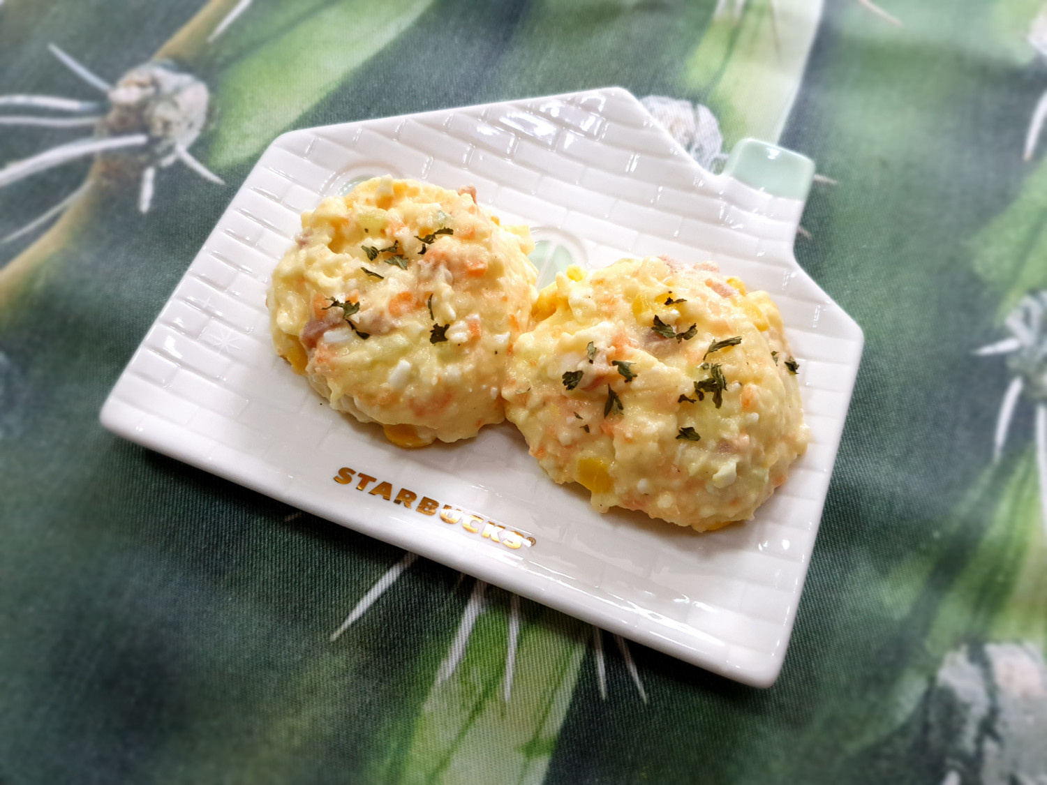 으깬 감자와 흰자가 담긴 볼에 물기를 제거한 옥수수콘, 잘게 다진 당근, 오이, 양파, 그리고 볶아둔 햄을 모두 넣어주세요. 여기에 마요네즈 10큰술, 설탕 6큰술, 허니 머스터드 3큰술, 소금 1/2큰술, 후추 1/2큰술을 넣고 모든 재료가 골고루 섞이도록 맛있게 버무려줍니다.