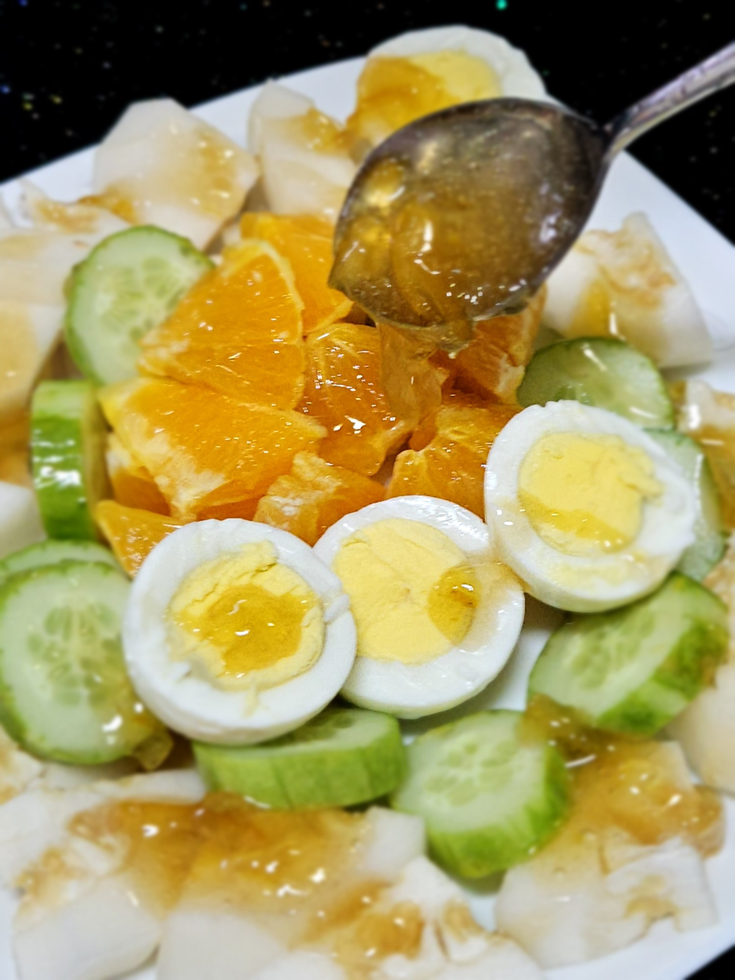 집에 남은 유자청을 활용하여 맛있는 과일 샐러드를 만들어 보세요! 제철 과일인 달콤한 참외와 향긋한 오렌지, 아삭한 오이를 섞고, 든든함을 더해줄 삶은 계란까지 곁들여 풍성한 한 끼 식사나 건강한 디저트로 손색이 없습니다. 집에 있는 과일들을 활용해 냉장고를 비우면서 맛있는 샐러드를 완성해 보세요.
