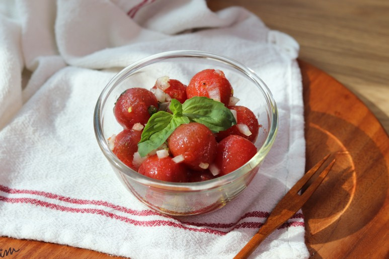 껍질을 벗겨 준비한 방울토마토를 넓은 볼에 담아주세요. 만들어둔 절임 소스를 토마토 위에 골고루 부어줍니다. 그 위로 곱게 다진 양파와 잘게 썬 바질을 넉넉하게 올려주세요. 숟가락이나 주걱을 이용해 토마토가 으깨지지 않도록 살살 버무려 모든 재료가 소스와 잘 어우러지도록 해주세요. 토마토 표면에 소스가 고루 묻도록 하는 것이 중요해요.