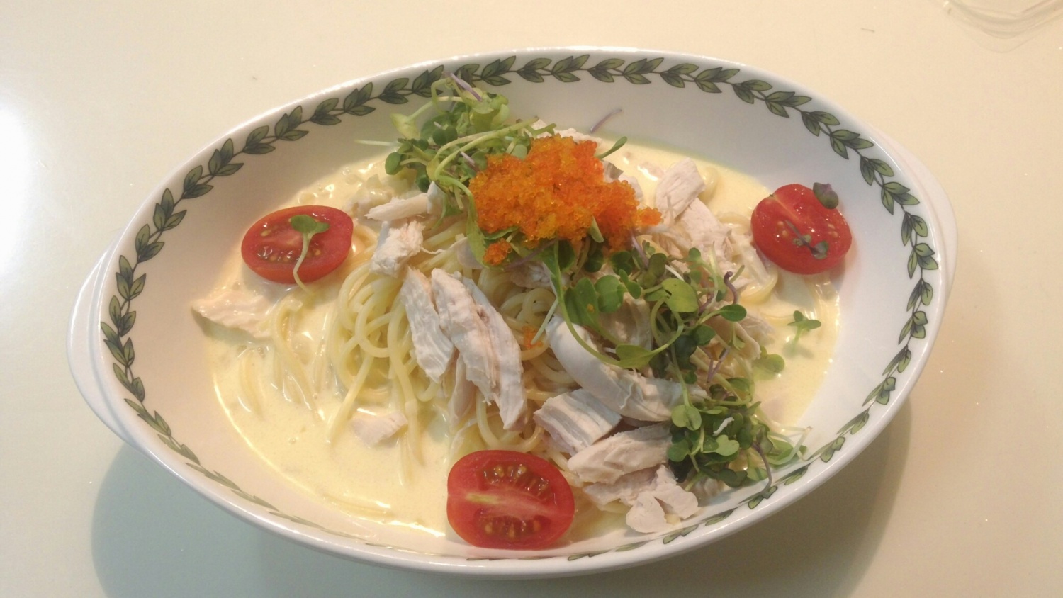 이제 보기 좋게 담아낼 차례입니다. 볼에 버무려진 파스타를 보기 좋게 담은 후, 남겨둔 닭가슴살을 위에 얹어줍니다. 어린잎 채소를 가지런히 펴서 올리고, 날치알을 가운데에 보기 좋게 올려주세요. 마지막으로 반으로 자른 방울토마토를 잘린 단면이 위로 보이도록 예쁘게 장식합니다.