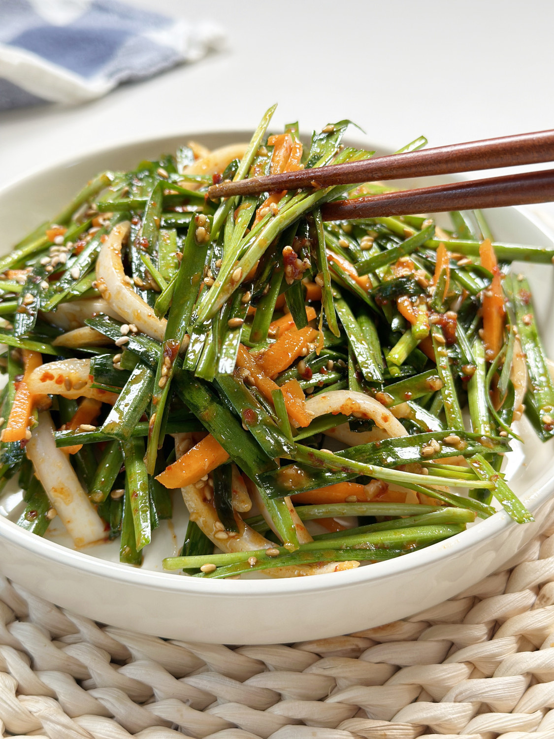 향긋한 부추와 아삭한 양파, 달콤한 당근이 만나 새콤달콤매콤한 맛의 조화를 이루는 부추양파무침 레시피를 소개합니다. 곰표 부산회초장을 사용해 특별한 양념 없이도 근사한 맛을 낼 수 있어요. 밥반찬으로도 훌륭하고, 고기 요리에 곁들이면 느끼함까지 잡아주는 최고의 궁합을 자랑합니다. 손님 초대 요리나 간단한 밑반찬으로도 손색없는 레시피이니 꼭 한번 따라해보세요!