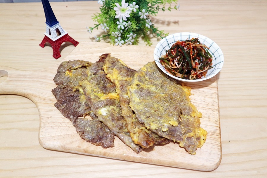 밑간한 소고기 앞뒤로 밀가루를 얇게 묻힌 후, 달걀물을 충분히 입혀주세요. 너무 두껍게 튀김옷을 입히면 느끼해질 수 있으니 얇게 묻히는 것이 포인트입니다.