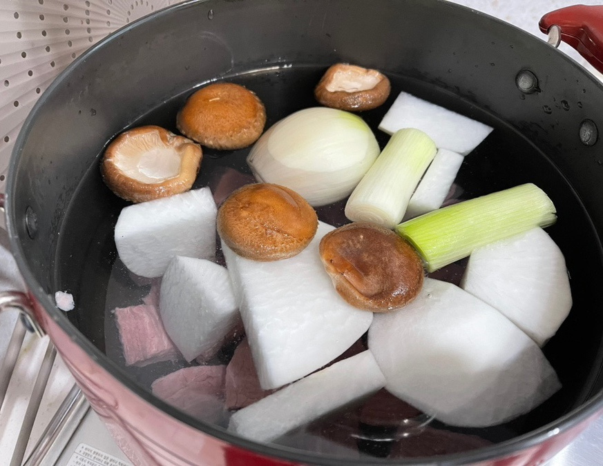큰 냄비에 핏물을 제거한 소고기와 손질한 양파, 대파, 무, 표고버섯을 모두 넣어주세요. 여기에 깨끗한 물 4000ml를 넉넉하게 붓고 센 불에서 끓이기 시작합니다. 냄비 크기를 충분히 고려하여 재료가 잠길 정도의 물 양을 맞춰주세요.