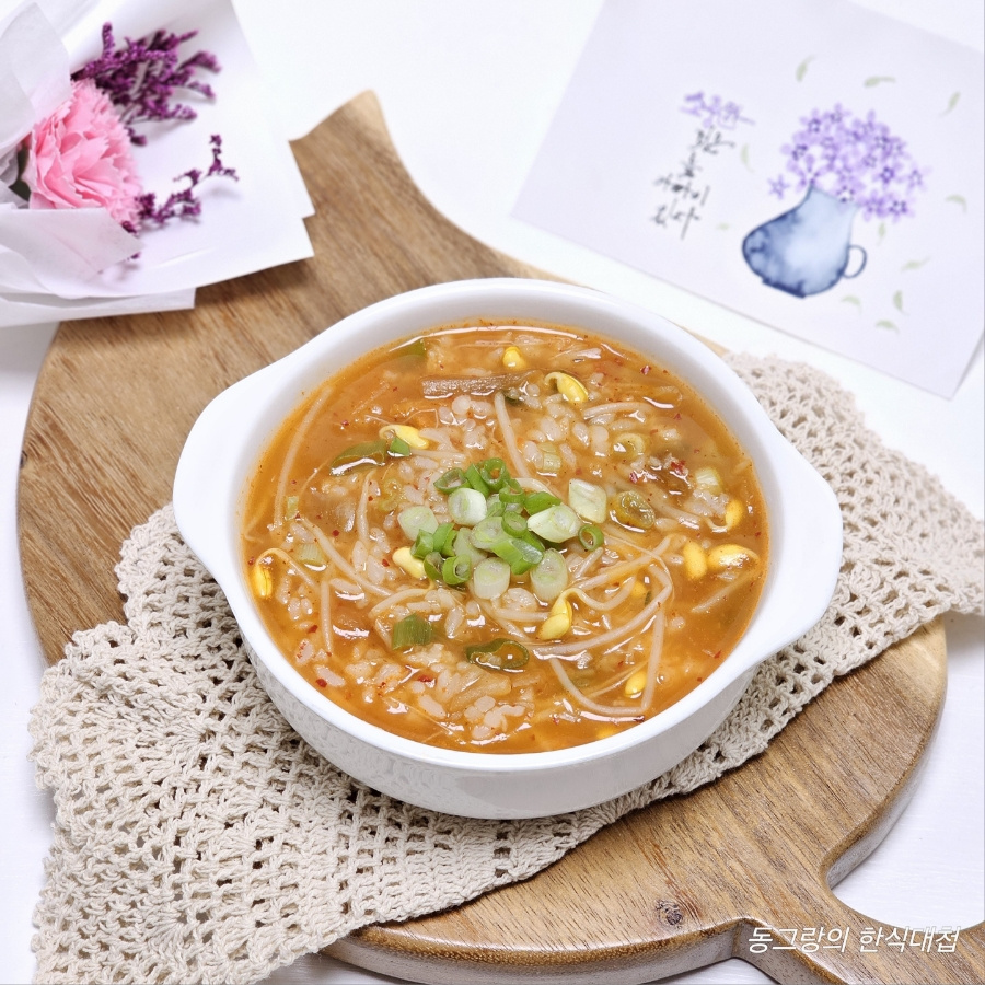 너무 오래 끓이면 밥알이 불어서 국물이 너무 졸아들 수 있습니다. 콩나물이 적당히 익었을 때 불을 꺼주세요. 부드럽고 촉촉한 상태가 가장 맛있습니다.