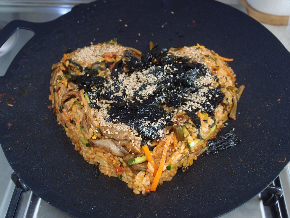 솥뚜껑 바닥에 밥이 살짝 눌어붙는 ‘지글지글’ 또는 ‘바삭바삭’하는 소리가 들리기 시작하면, 숟가락으로 모든 재료를 잘 섞어 비벼줍니다. 원하는 모양을 만들면서 비벼주면 더욱 재미있어요. 가스불은 중불을 유지하며 계속 켜 두세요. 사랑스러운 하트 모양으로 만들어 보아도 좋겠죠?