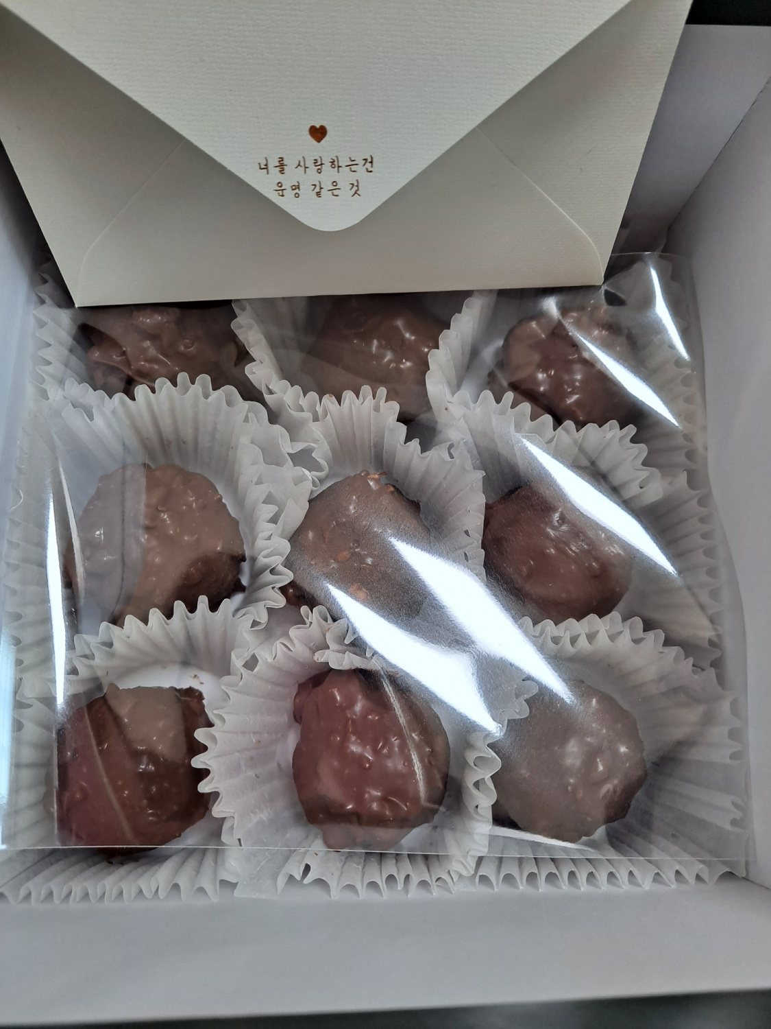 완전히 굳은 초콜릿은 준비된 종이 머핀컵에 하나씩 담아줍니다. 예쁜 초콜릿 상자에 담고, 투명한 OPP 봉투로 덮어 포장해주면 수제 페레로 로쉐 초콜릿 완성입니다! 정성 가득한 선물 포장이 마무리 단계입니다.