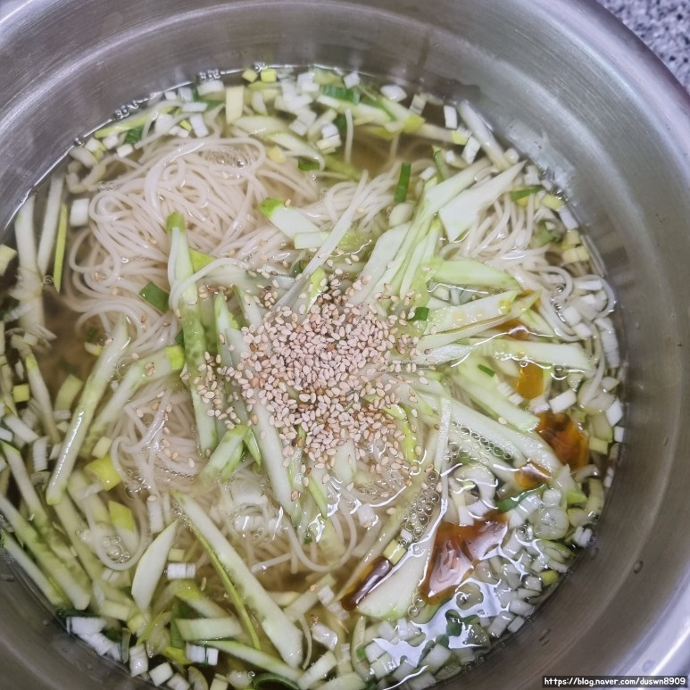 완성된 냉국 육수에 재워둔 오이와 송송 썬 대파(또는 쪽파), 통깨를 넣고 잘 섞어줍니다. 그릇에 물기 뺀 국수를 담고 준비된 냉국 육수를 부어줍니다. 마지막으로 얼음 3~4개를 띄워주면 시원함이 배가 되는 맛있는 오이냉국수가 완성됩니다! 기호에 따라 참기름을 약간 둘러 풍미를 더해도 좋습니다.