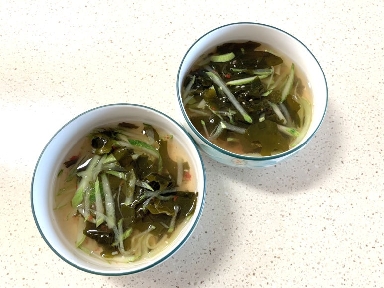 이렇게 완성된 오이미역냉국은 바로 드시는 것보다 냉장고나 김치냉장고에 넣어 최소 30분 이상 차갑게 식혀 드시면 더욱 맛있습니다. 만약 냉장고에 넣어두셨다면, 드실 때 얼음 2~3개를 동동 띄워 시원함을 극대화해도 좋습니다.