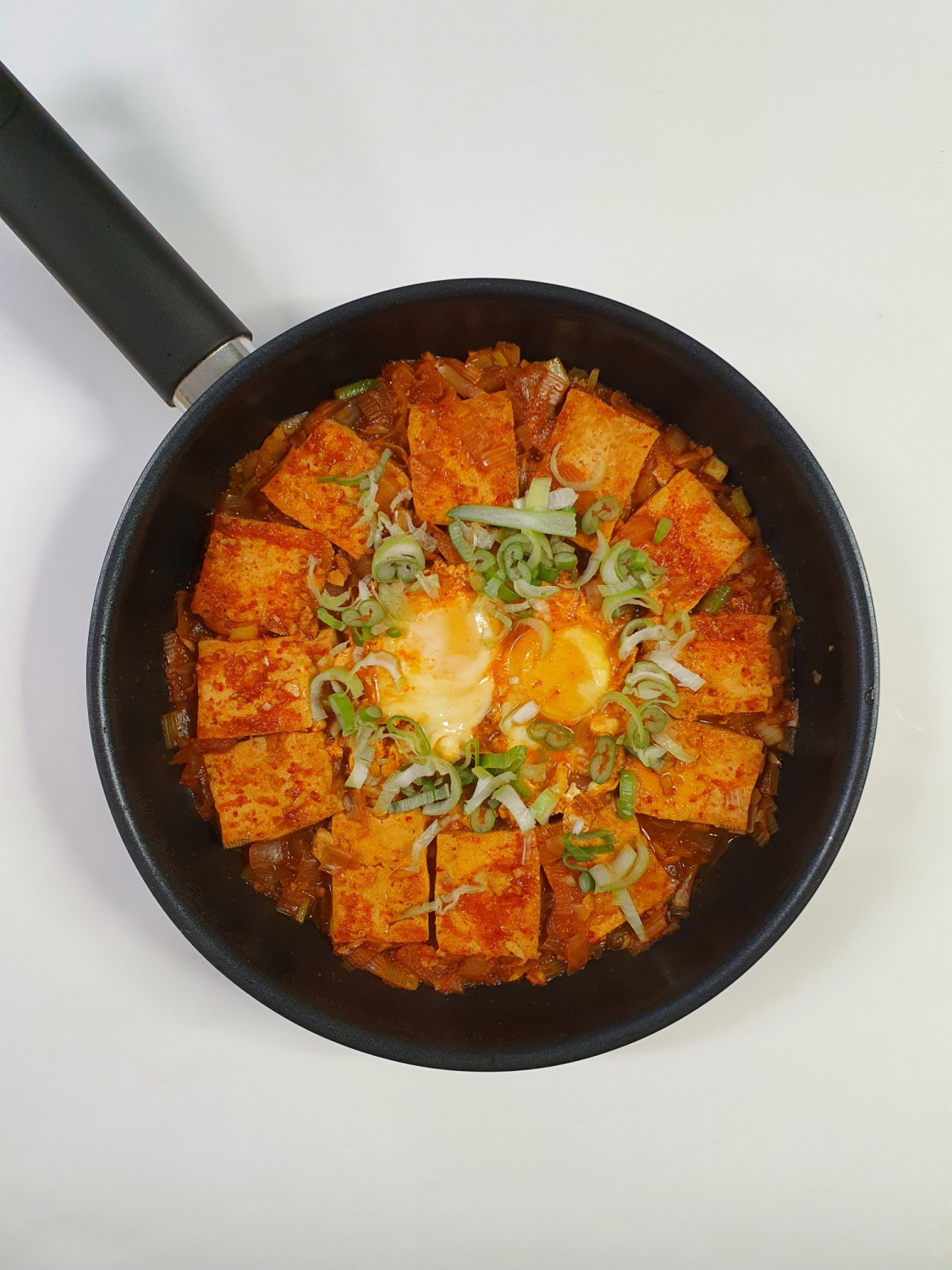 노릇하게 구워진 두부를 양념장 위에 둘러가며 보기 좋게 놓아줍니다. 팬의 중앙 부분은 계란이 들어갈 자리로 비워둡니다.