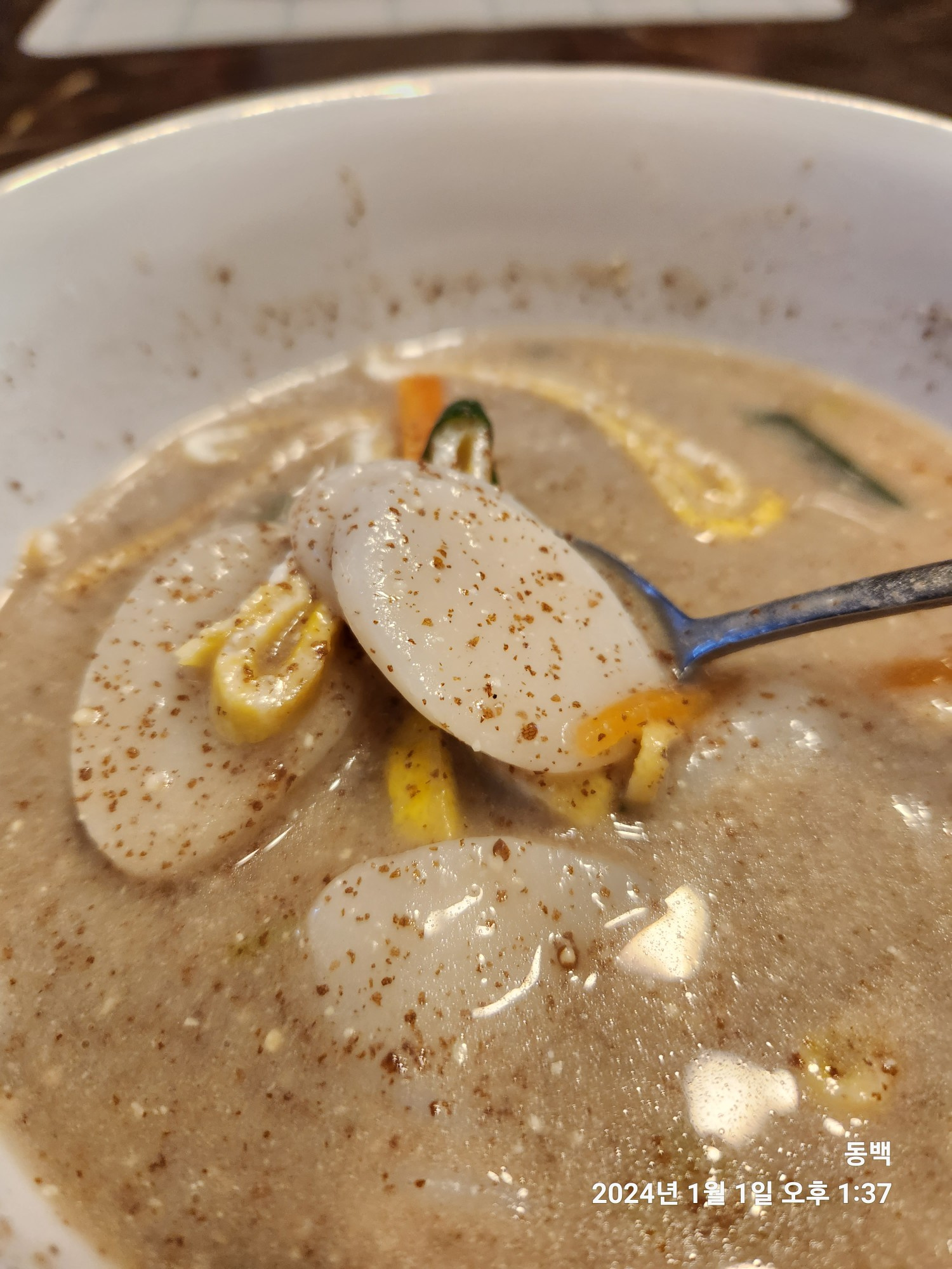 떡이 말랑말랑하게 익어 국 위로 떠오르면, 썰어둔 대파를 넣고 3분 정도 더 끓여줍니다. 이때 굵은소금과 참치액젓으로 기호에 맞게 간을 맞춰주세요. (선택 사항: 집에 당근이 있다면 얇게 채 썰어 함께 넣어 색감을 더해도 좋습니다.) 완성된 생들깨 떡국은 따뜻한 국그릇에 푸짐하게 담아내고, 준비한 달걀 지단 고명을 올려 맛있게 즐겨주세요.