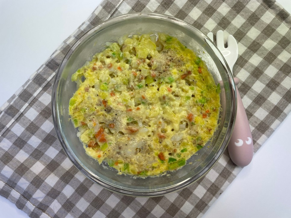 마지막으로 고소한 깨소금 약간과 참기름 1/2 큰술을 넣고 한 번 더 골고루 섞어줍니다. 전자레인지용기 위에 랩을 씌운 뒤, 젓가락이나 포크로 작은 구멍을 몇 개 뚫어 증기가 빠져나갈 수 있도록 해주세요. 이제 전자레인지에 넣고 약 5분간 가열하면, 아기도 좋아하는 맛있는 계란찜밥이 완성됩니다! (전자레인지 사양에 따라 시간은 조절해주세요.)