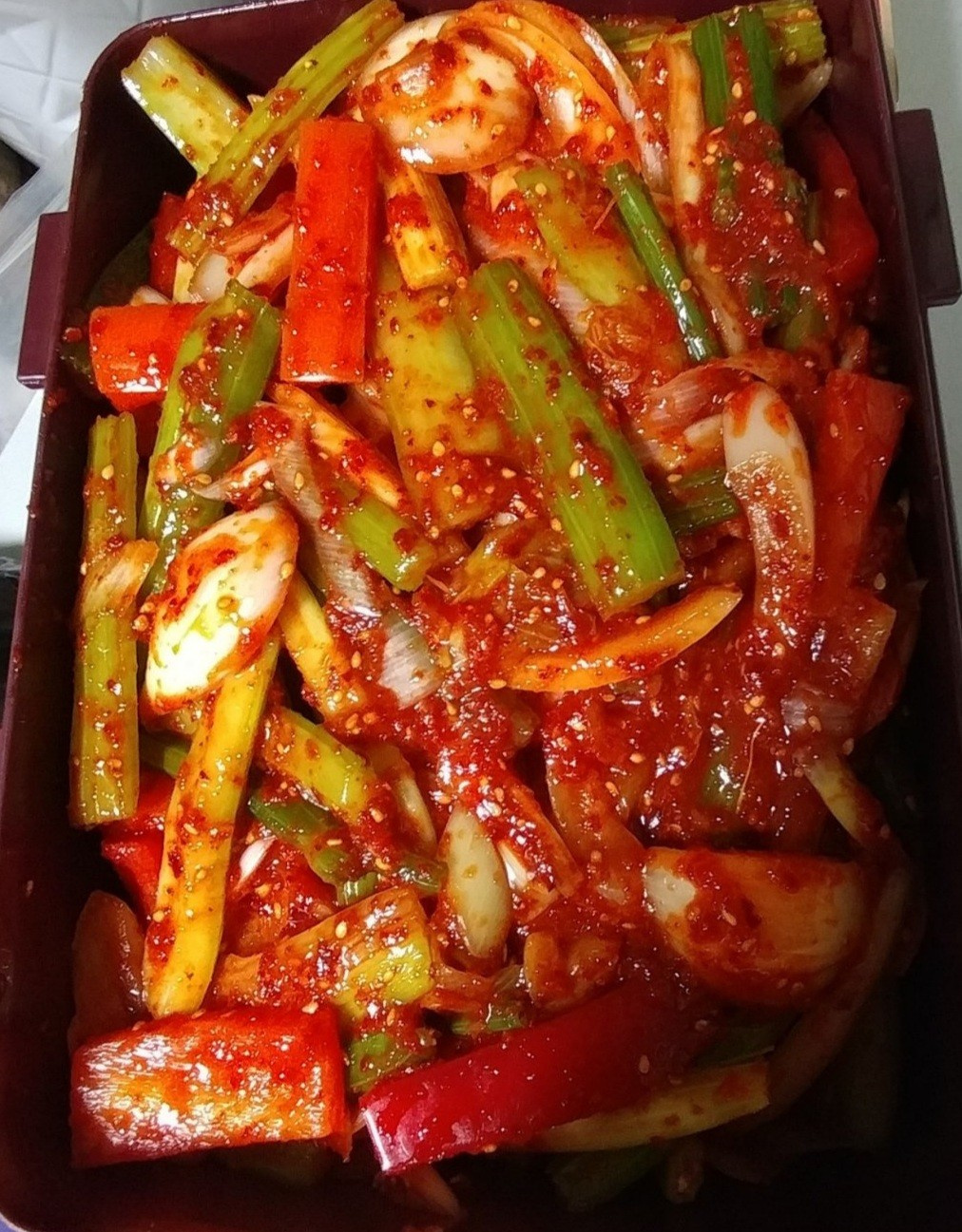 마지막으로 깨소금을 솔솔 뿌려주면 아삭아삭한 식감이 살아있는 샐러리 김치 완성입니다! 바로 드셔도 좋고, 살짝 숙성시켜 드셔도 맛있어요. 특히 만두와 함께 곁들이면 그 맛이 배가 됩니다.