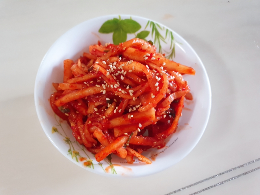 보기에도 먹음직스러운 빨간 빛깔의, 아삭하고 맛있는 무생채가 완성되었습니다! 따뜻한 밥 위에 올려 비벼 먹거나, 삼겹살 등 구이 요리에 곁들여도 정말 맛있답니다. 지금 바로 만들어 보세요!