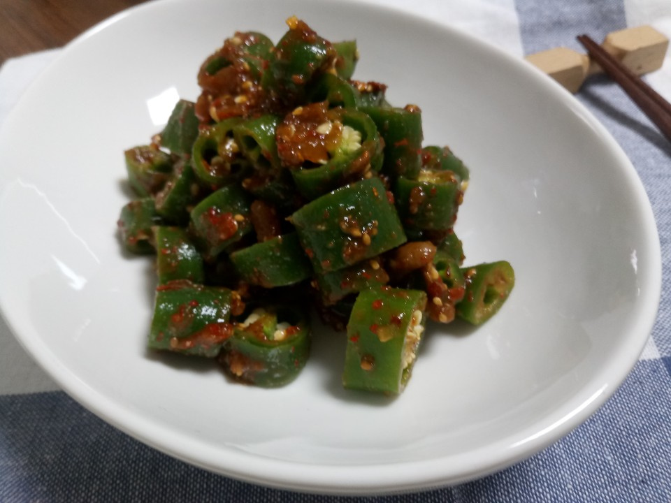 깨끗하게 씻은 오이 고추는 1cm 정도의 두께로 먹기 좋게 잘라주세요. 준비된 양념장에 오이 고추를 넣고, 양념이 고추에 골고루 배도록 살살 버무려주면 맛있는 오이 고추 무침 완성입니다. 너무 세게 무치면 물이 생길 수 있으니 부드럽게 섞어주세요.