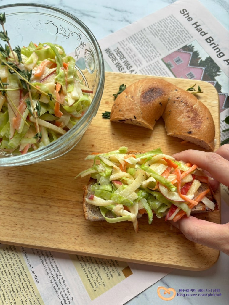 이렇게 완성된 양배추 사과 샐러드는 별도의 불을 사용하지 않아도 돼서 간편하며, 어떤 요리에도 잘 어울리는 장점이 있습니다. 아삭아삭 씹히는 식감과 상큼달콤한 맛이 일품이라 밥반찬으로 곁들이기에도 좋고, 든든한 브런치 메뉴나 베이글에 속재료로 넣어 샌드위치로 즐기기에도 아주 훌륭합니다. 상상만 해도 맛있는 베이글 샌드위치, 꼭 한번 만들어 보세요!