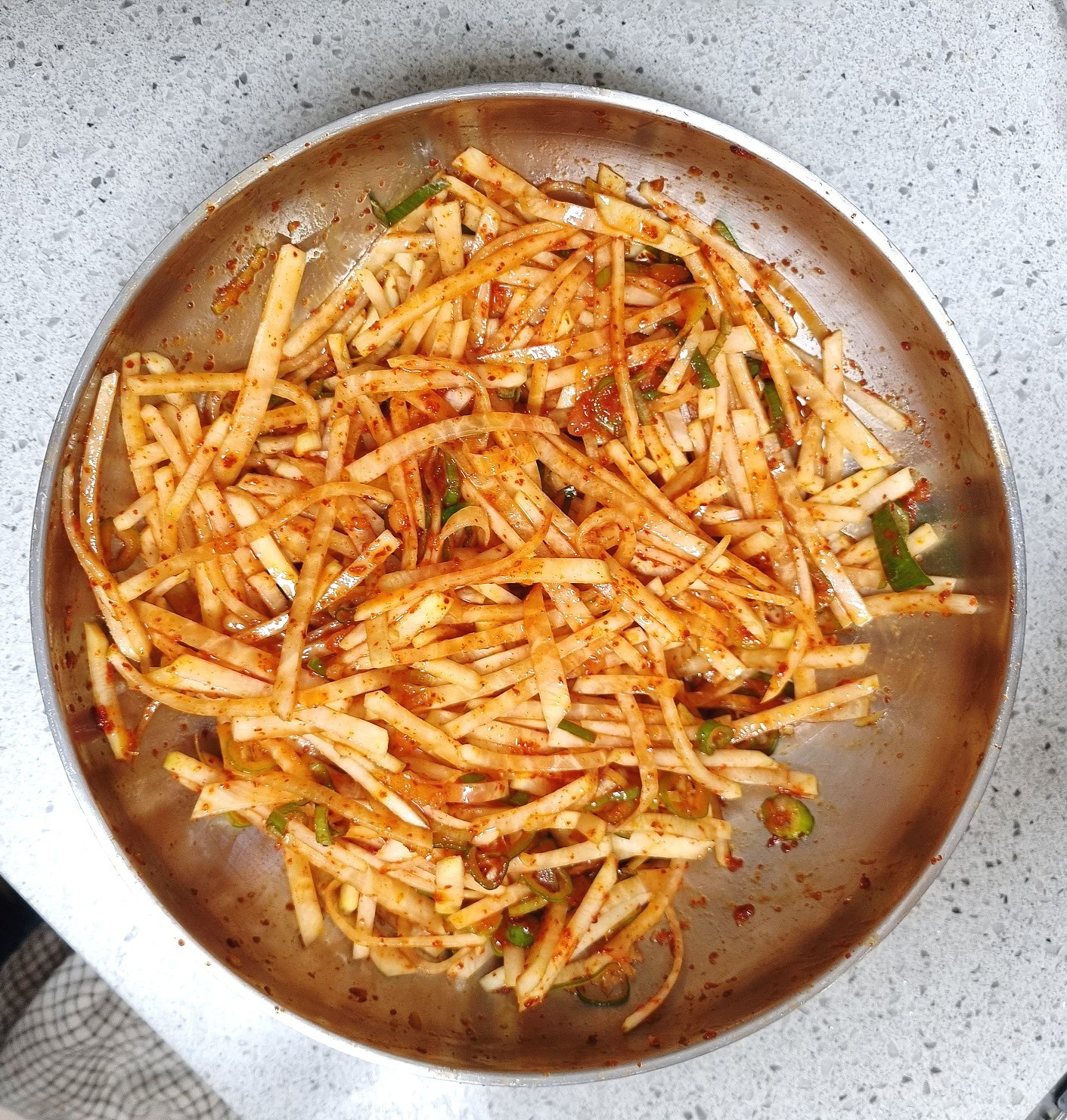 썰어놓은 무는 깨끗하게 씻은 후, 먹기 좋은 크기(약 0.5cm 두께의 채썰기)로 썰어주세요. 너무 얇으면 물러지고, 너무 두꺼우면 양념이 잘 배지 않으니 적당한 두께로 썰어주는 것이 중요합니다.