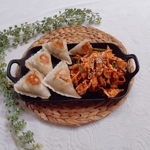 그릇에 노릇하게 구워진 군만두를 보기 좋게 담고, 그 위에 방금 버무린 새콤달콤한 야채 무침을 듬뿍 올려주세요. 마지막으로 고소함을 더해줄 통깨를 솔솔 뿌려주면, 보기에도 먹음직스러운 야채 비빔만두 완성입니다! 바삭한 만두와 아삭한 채소, 매콤달콤한 양념의 조화가 정말 일품이니 꼭 한번 만들어 드셔보세요.