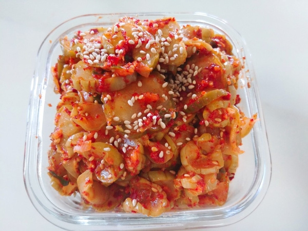 마지막으로 깨소금을 솔솔 뿌려준 뒤, 양념이 오이지에 골고루 배도록 조물조물 부드럽게 무쳐주면 맛있는 오이지무침 완성입니다. 바로 드셔도 좋고, 냉장고에 잠시 넣어두었다 드시면 더욱 시원하고 맛있습니다.