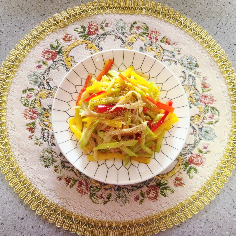 준비해둔 오이채, 찢어놓은 크래미, 채 썬 파프리카를 냉채 소스 볼에 모두 넣어주세요. 형형색색의 재료들이 맛있는 소스와 만나 더욱 기대감을 높여줍니다.