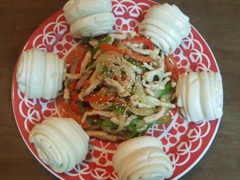 마지막으로 불을 끄기 직전에 참기름 1큰술을 두르고 통깨 1 작은술을 솔솔 뿌려주세요. 고소한 참기름 향과 고소한 깨가 어우러져 풍미를 더해줍니다. 맛있는 고추잡채 완성입니다! 따끈하게 찐 꽃빵과 함께 푸짐하게 즐겨보세요.