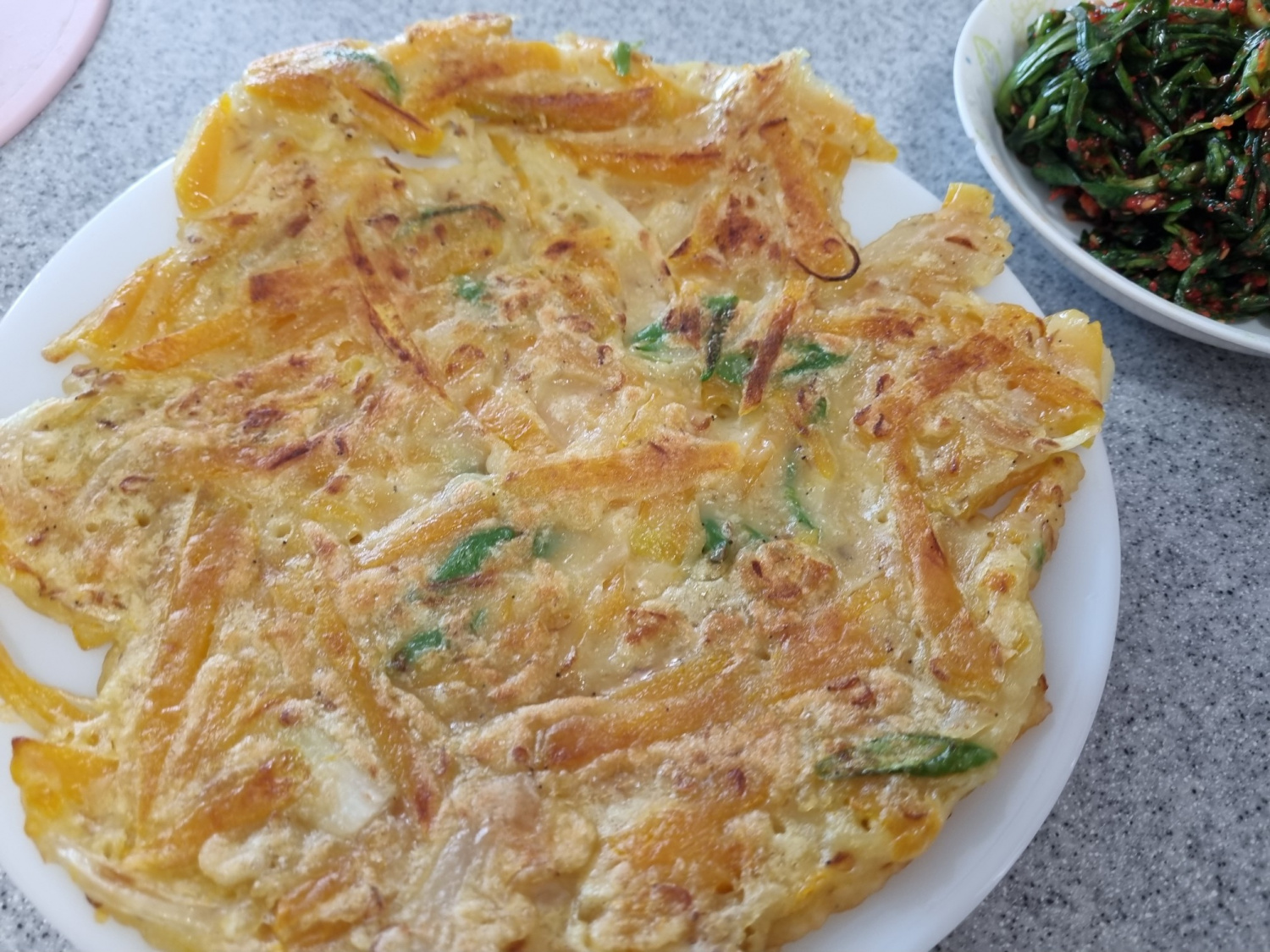 달군 팬에 식용유 1큰술을 두르고, 호박 반죽을 국자 등으로 적당량 떠서 올립니다. 최대한 얇게 펴주는 것이 바삭하고 맛있게 구워지는 비결입니다. 중약불에서 앞뒤로 노릇노릇하게 구워주세요. (얇게 펴야 속까지 잘 익고 식감이 좋습니다.)