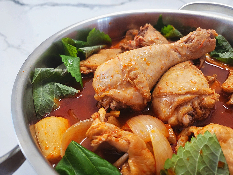 맛있게 끓여진 닭볶음탕을 완성된 냄비째 그대로 식탁에 올려 푸짐하게 즐기시면 됩니다! 취향에 따라 깻잎이나 청양고추를 추가하면 더욱 다채로운 맛을 즐기실 수 있습니다. 뜨거울 때 밥 한 공기와 함께 드시면 정말 맛있답니다!
