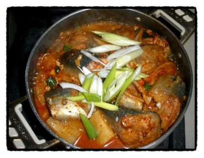 불을 중불로 유지하며 뚜껑을 덮고 고등어가 완전히 익을 때까지 약 10~15분간 끓여줍니다. 중간에 국물이 졸아들면 육수나 물을 조금 더 추가해주세요. 고등어가 거의 다 익었을 때, 송송 썬 청양고추와 홍고추를 넣어 칼칼한 맛과 색감을 더해줍니다.