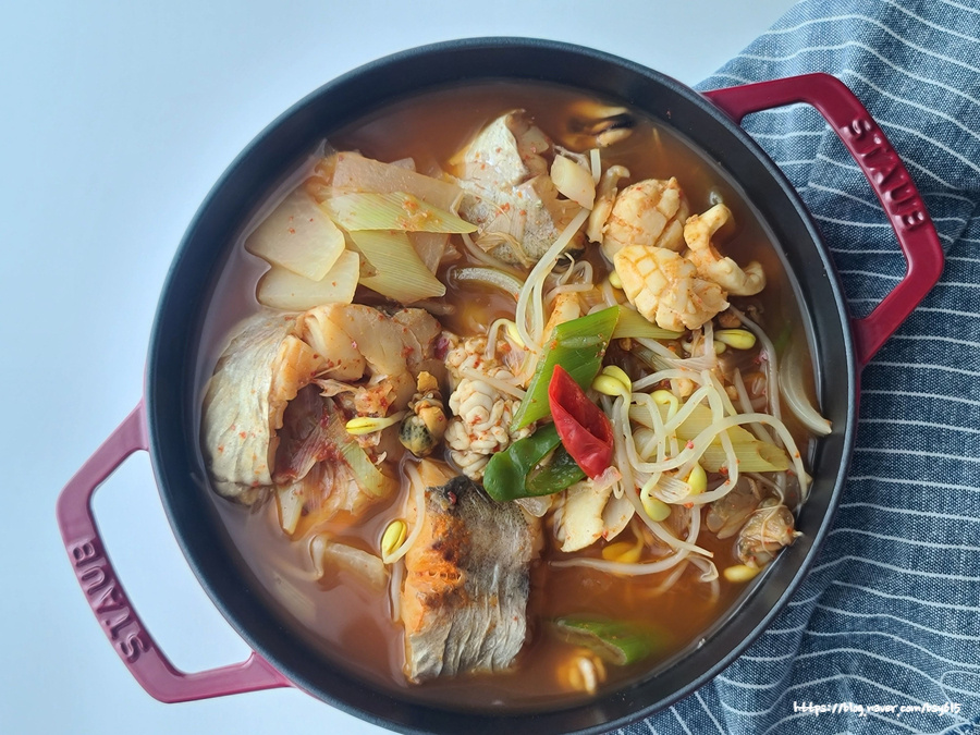 무가 어느 정도 익어 국물에 시원한 맛이 우러나기 시작하면, 미리 준비해둔 다진 마늘 1큰술을 넣고, 맛술로 버무려둔 해물 믹스도 넣어주세요. 곧이어 콩나물, 채 썬 양파, 어슷 썬 대파, 그리고 청양고추까지 모두 한꺼번에 넣고 재료들이 익고 국물 맛이 충분히 우러날 때까지 끓여줍니다. 야채의 신선한 맛과 해물의 감칠맛이 어우러져 더욱 깊은 맛을 낼 거예요.