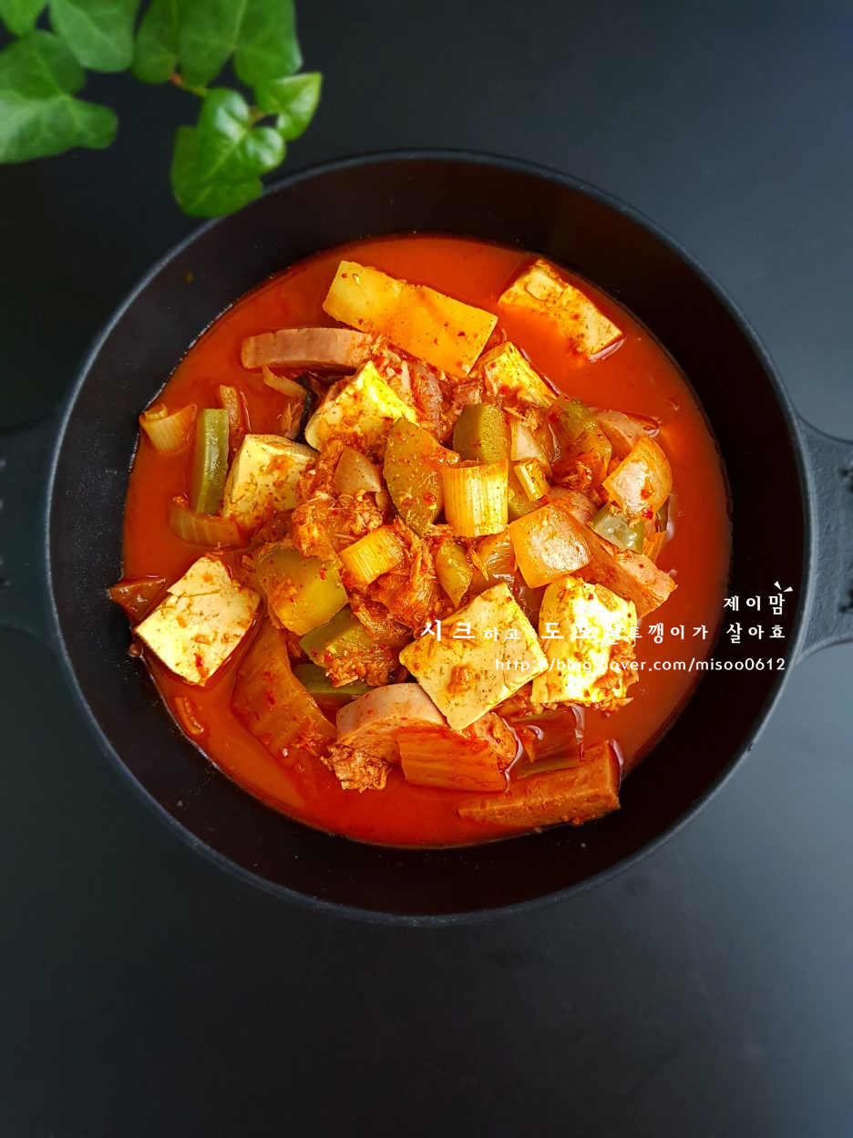 모든 재료를 먹기 좋게 손질해 주세요. 스팸과 두부는 한 입 크기로 썰고, 감자, 애호박, 양파는 약간 도톰하게 썰어줍니다. 대파와 청양고추는 송송 썰어 준비합니다. 신 김치는 약 1컵 분량으로 적당한 크기로 썰어주세요.