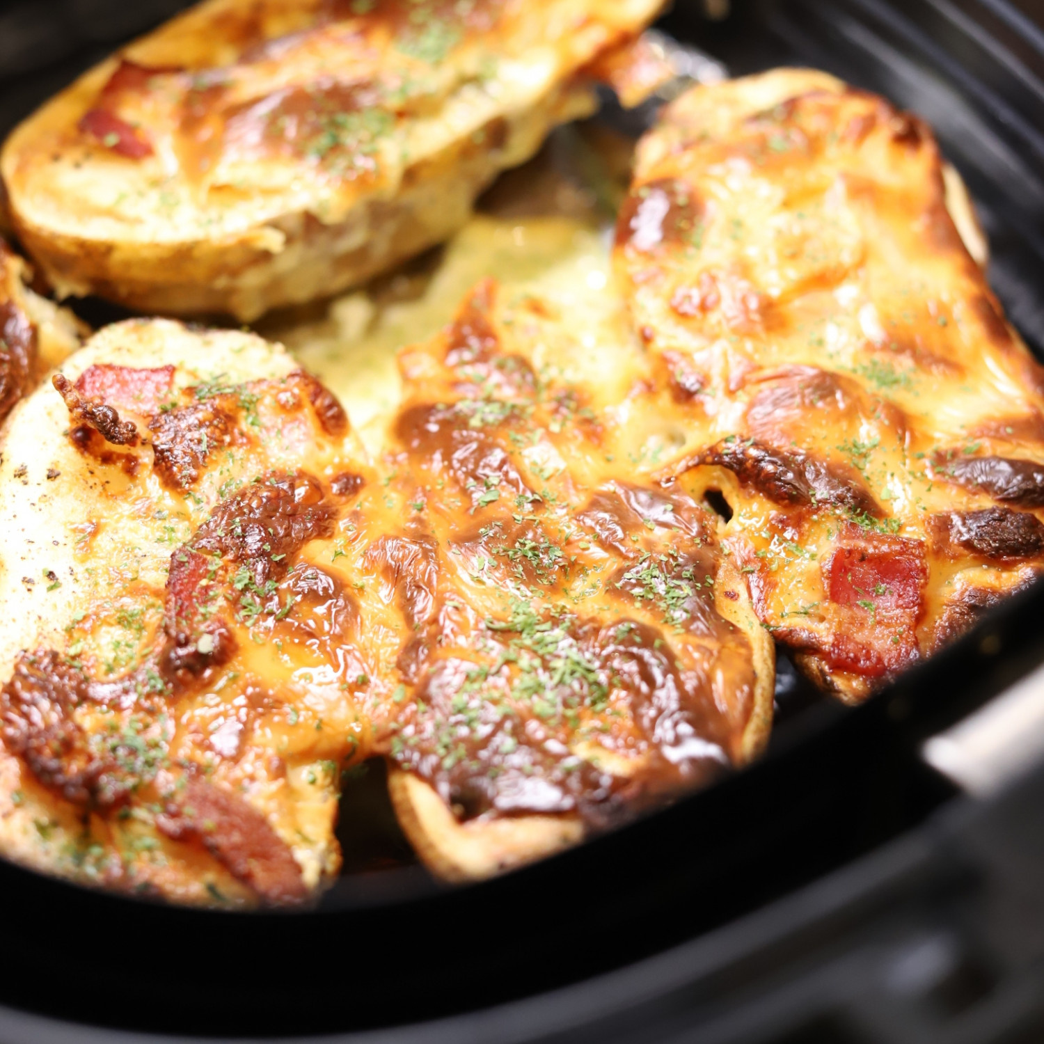 20분 후, 에어프라이어 바구니를 열어 1차로 구워진 감자 위에 썰어둔 베이컨과 화이트 체다치즈를 보기 좋게 올려줍니다. 온도를 화씨 300도(°F) (섭씨 150도(°C))로 낮추고, 10분 동안 추가로 구워주세요. 노릇하게 구워진 치즈와 베이컨이 올라간 통감자 치즈구이가 완성됩니다. 마지막으로 건 파슬리 가루를 솔솔 뿌려 장식하면 더욱 먹음직스럽게 즐길 수 있습니다.