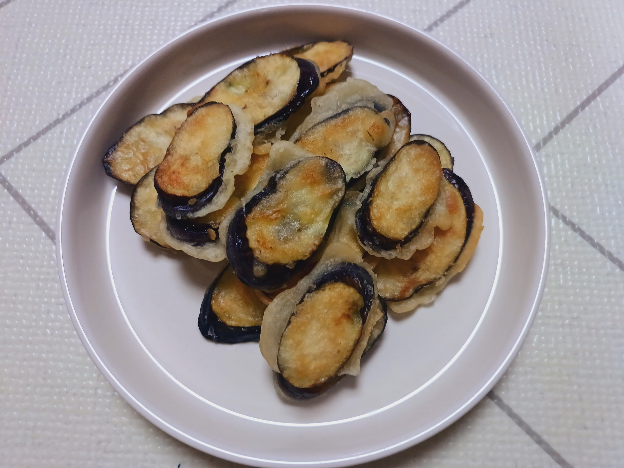 준비해둔 가지를 튀김 반죽에 넣고 앞뒤로 골고루 묻혀주세요. 반죽이 가지 표면에 얇고 고르게 코팅되도록 하는 것이 좋습니다. 반죽이 너무 두껍게 묻으면 튀김옷이 눅눅해질 수 있어요.