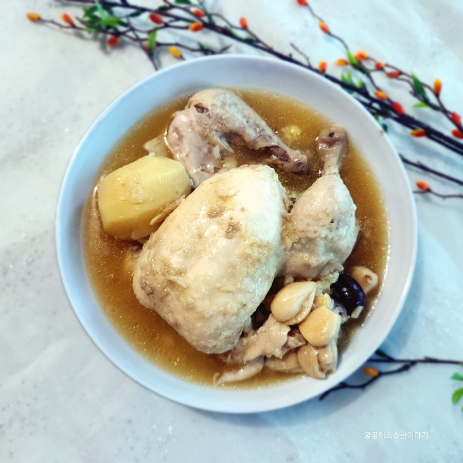 압력솥을 준비하여 손질된 닭을 조심스럽게 넣습니다. 그 위에 통마늘, 껍질 벗긴 감자, 큼직하게 썬 양파, 가시오가피, 그리고 대추를 함께 넣어주세요. 모든 재료를 넣었다면 압력솥 뚜껑을 단단히 닫고, 이제 푹 삶아질 시간만을 기다리면 됩니다. 압력솥을 사용하면 일반 냄비보다 훨씬 짧은 시간 안에 닭이 부드럽게 익고 국물 맛도 깊게 우러나옵니다.