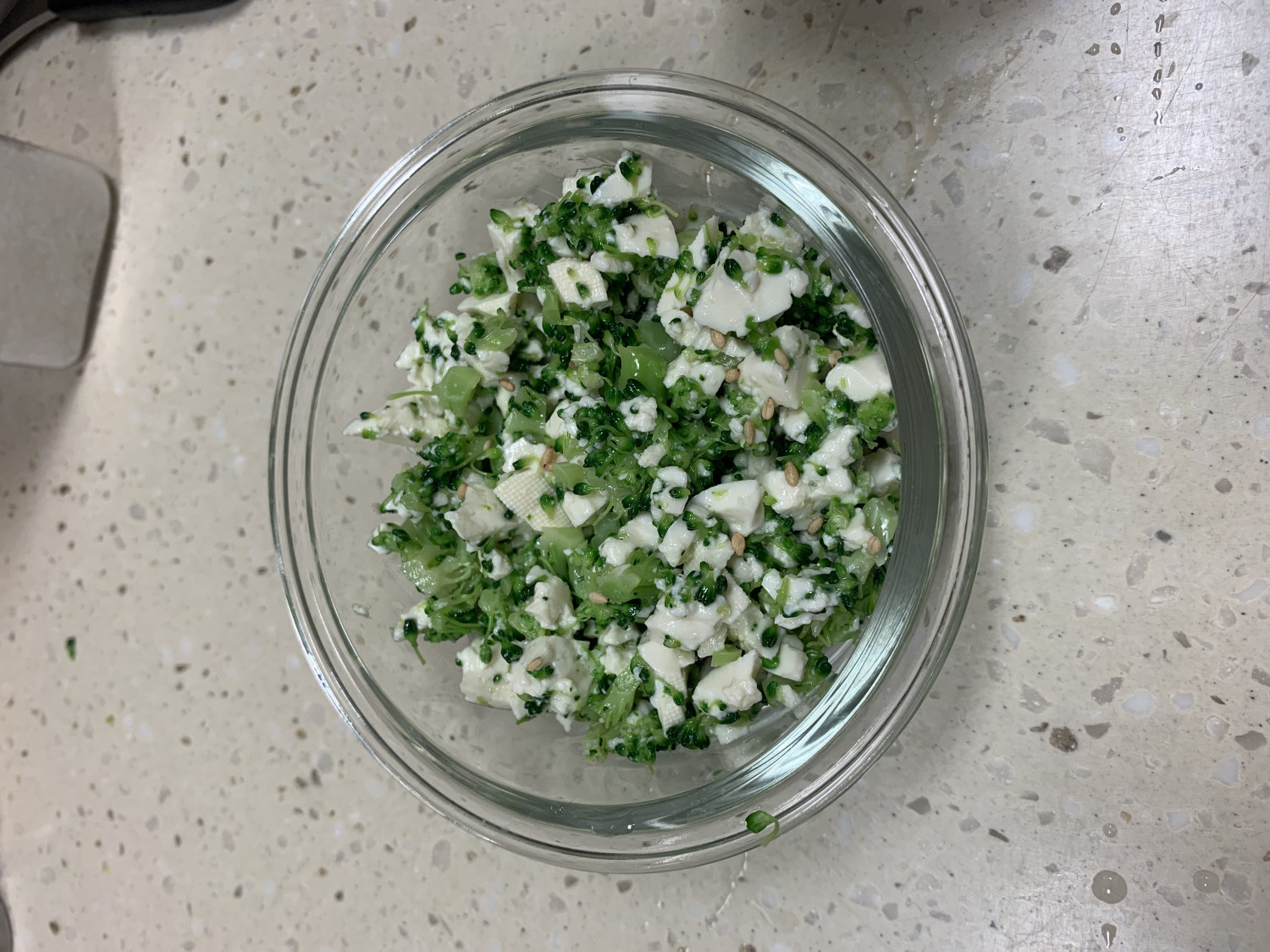 데친 두부도 마찬가지로 식혀준 뒤, 칼을 사용해 부드럽게 으깨듯이 다져주세요. 덩어리가 너무 크지 않도록, 브로콜리와 비슷한 크기로 다져주면 섞었을 때 식감이 더욱 좋아요.