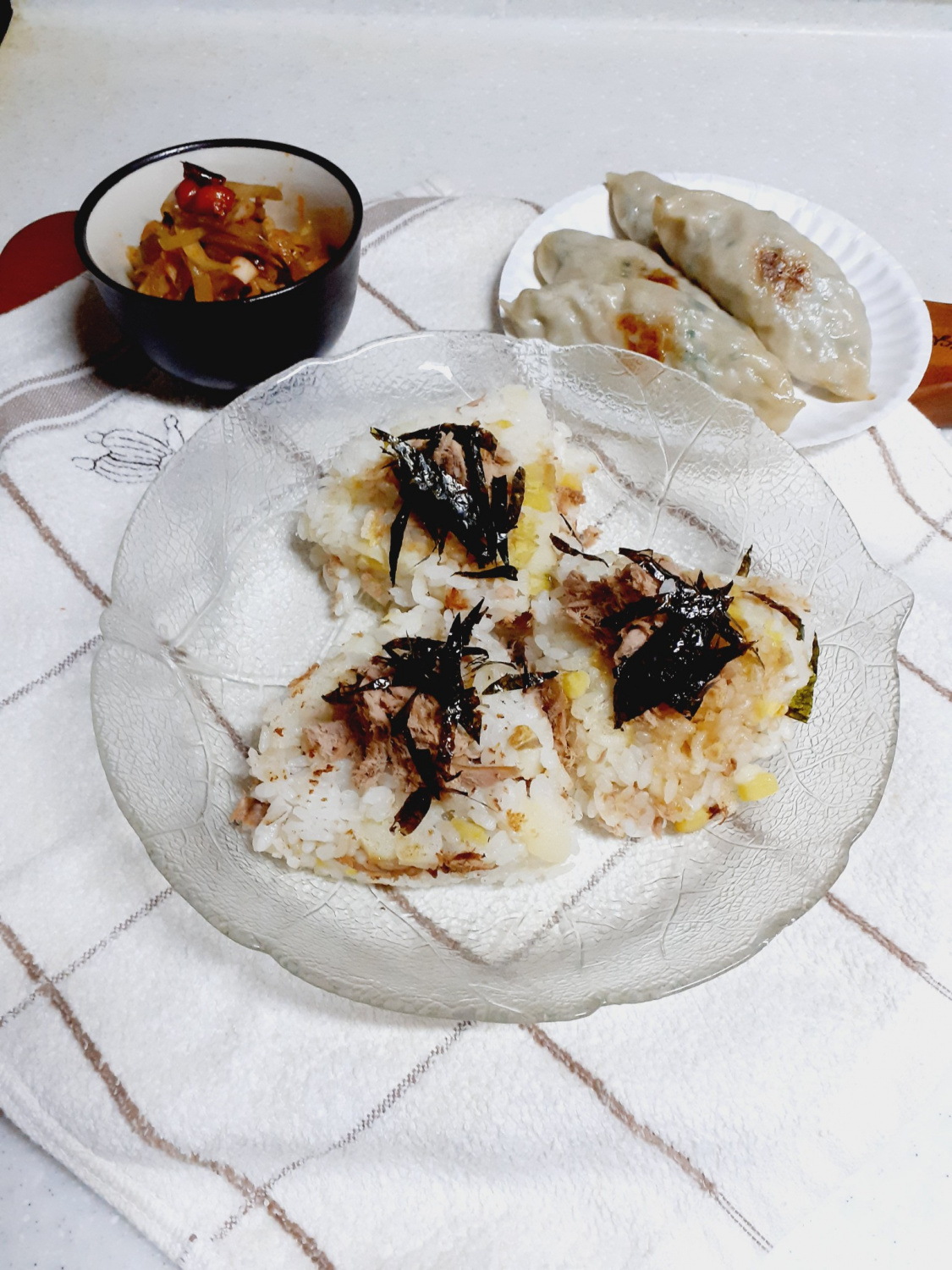 먹음직스럽게 구워진 주먹밥을 접시에 예쁘게 담아주세요. 그 위에 남은 볶은 참치를 조금씩 올리고, 김을 잘게 썰어 솔솔 뿌려 장식하면 완성! 보기에도 좋고 맛도 좋은 근사한 주먹밥이 탄생했습니다.