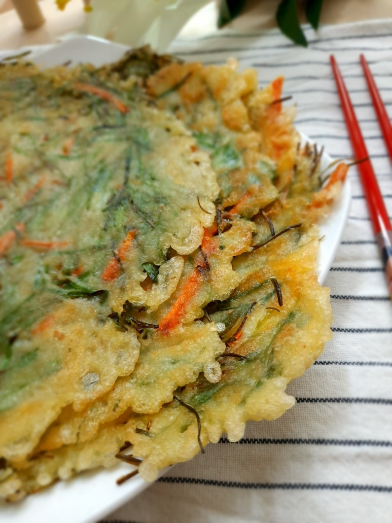 먼저, 볼에 부침가루를 적당량 담고 물을 조금씩 부어가며 젓가락으로 잘 섞어주세요. 반죽은 너무 되직하지 않고, 팬 위에서 얇게 펴질 정도로 약간 묽게 만드는 것이 포인트입니다. afterwards, clean and thinly slice the nutritious chives and the carrot. Add these prepared vegetables into the batter and gently mix them together. Ensure the vegetables are evenly coated with the batter for a delightful bite.